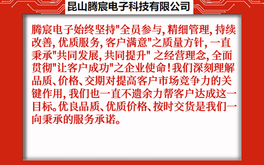 昆山騰宸電子科技有限公司位于中國線路板加工之都昆山千燈,公司專注于電路板研發(fā)設(shè)計(jì)、PCB抄板、元器件采購、SMT貼片加工、組裝測試,為客戶提供一站式電子制造服務(wù)。騰宸電子始終堅(jiān)持"全員參與,精細(xì)管理,持續(xù)改善,優(yōu)質(zhì)服務(wù),客戶滿意"之質(zhì)量方針,一直秉承"共同發(fā)展,共同提升" 之經(jīng)營理念,全面貫徹"讓客戶成功"之企業(yè)使命!我們深刻理解品質(zhì)、價(jià)格、交期對提高客戶市場競爭力的關(guān)鍵作用,我們也一直不遺余力幫客戶達(dá)成這一目標(biāo)。優(yōu)良品質(zhì)、優(yōu)質(zhì)價(jià)格、按時(shí)交貨是我們一向秉承的服務(wù)承諾。 ...